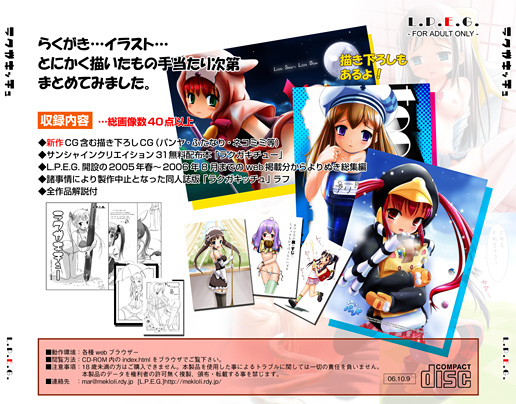 ラクガキッチュ(完売)発行日:2006年10月9日(アブノーマルカーニバル) サンプル ▼概要 18禁。サイトのらくがきやパンヤCG。エロ分は放尿・ふたなり・スク水半脱ぎ等。 |